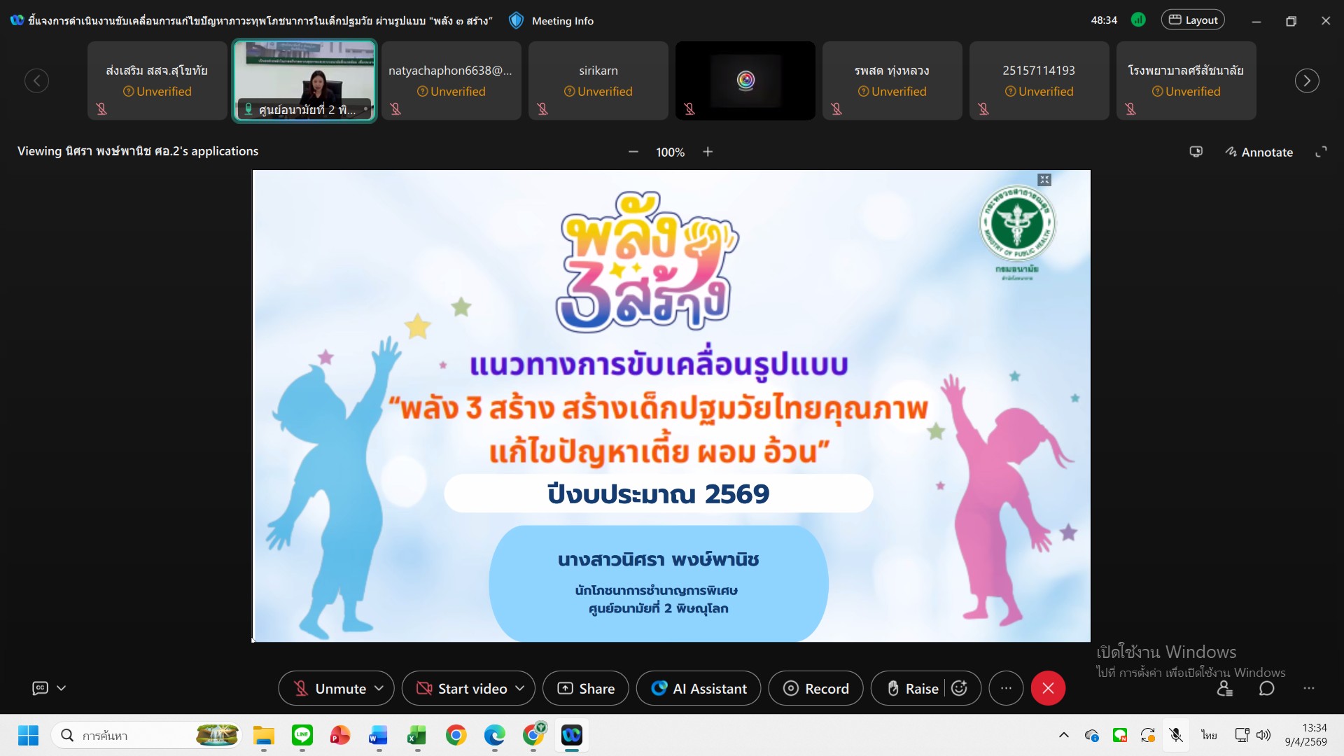 แพทย์หญิงไสววรรณ ไผ่ประเสริฐ ผู้อำนวยการศูนย์อนามัยที่ 2 พิษณุโลก มอบหมายให้นางสาวนิศรา พงษ์พานิช นักโภชนาการชำนาญการพิเศษ เป็นวิทยากรประชุมชี้แจงการขับเคลื่อนการจัดการและแก้ไขปัญหาภาวะเตี้ย ผอม อ้วน ภายใต้รูปแบบ “พลัง 3 สร้าง” จังหวัดสุโขทัย วันที่ 9 เมษายน 2569 ณ ห้องประชุมทางไกล ชั้น 1 ศูนย์อนามัยที่ 2 พิษณุโลก ผ่านระบบออนไลน์ เพื่อเพิ่มประสิทธิภาพการทำงานให้กับบุคลากรและภาคีเครือข่ายในการขับเคลื่อนการจัดการและแก้ไขปัญหาภาวะเตี้ย ผอม อ้วน ภายใต้รูปแบบ “พลัง 3 สร้าง” จังหวัดสุโขทัย กลุ่มเป้าหมายประกอบด้วย ผู้รับผิดชอบงานอนามัยแม่เด็ก ระดับจังหวัด ระดับอำเภอ ระดับตำบล เครืองข่ายองค์การบริหารส่วนท้องถิ่น และครูในสถานพัฒนาเด็กปฐมวัย ตำบลพื้นที่นำร่อง 9 ตำบล (9 อำเภอ) ในจังหวัดสุโขทัย