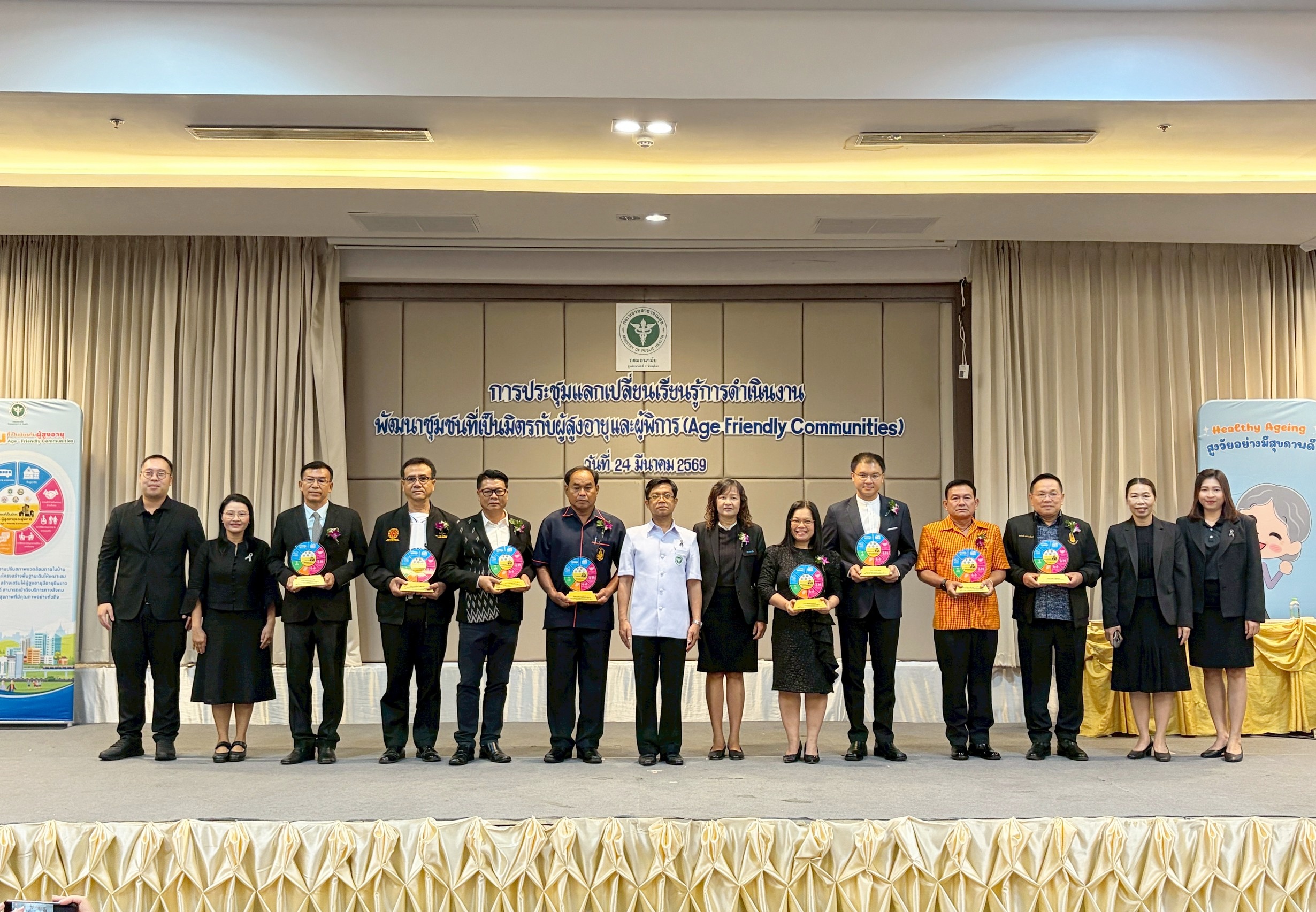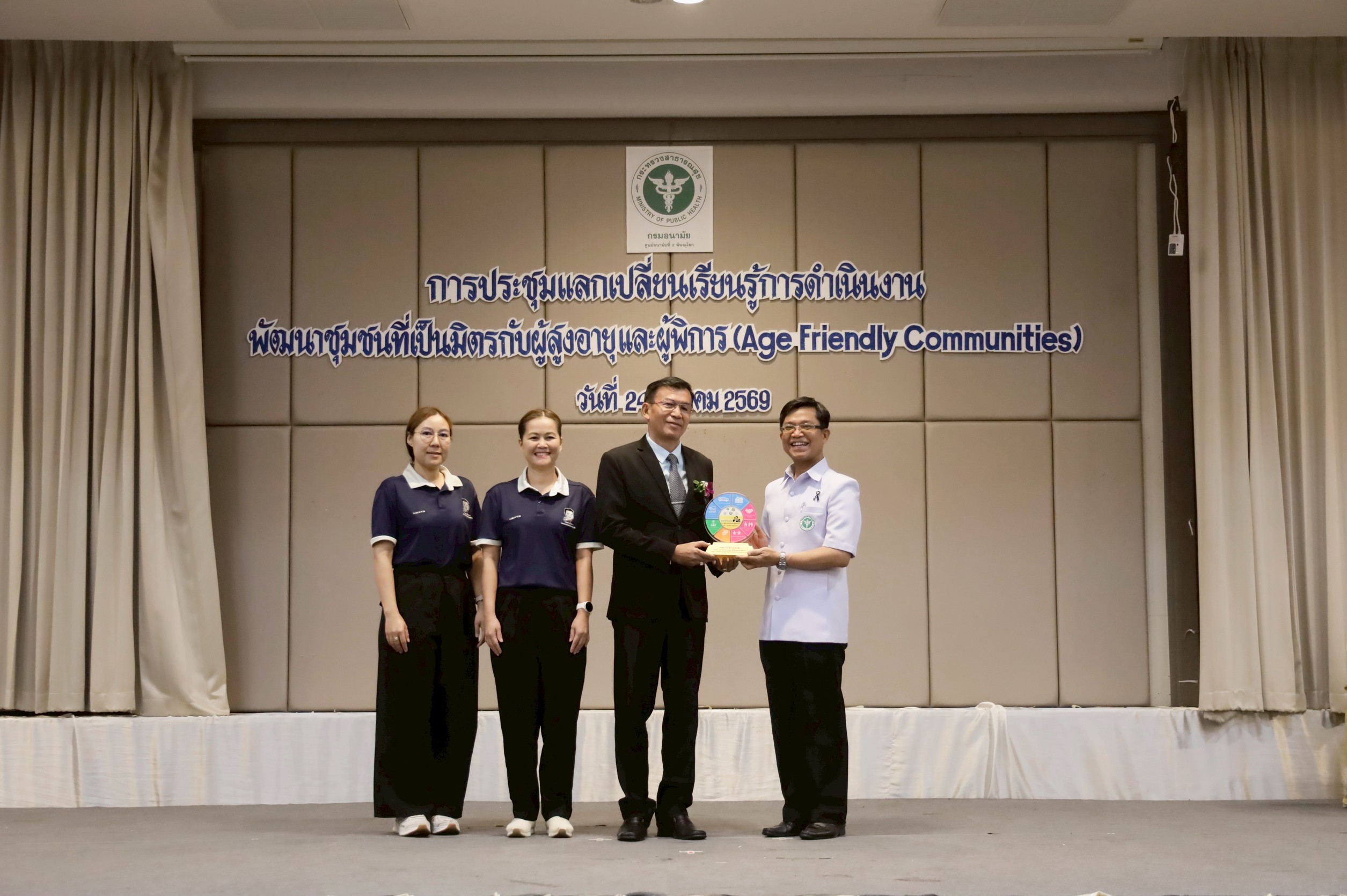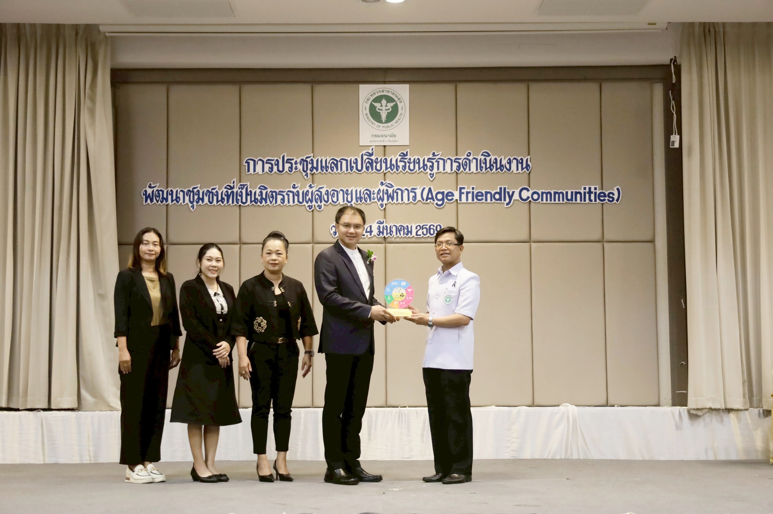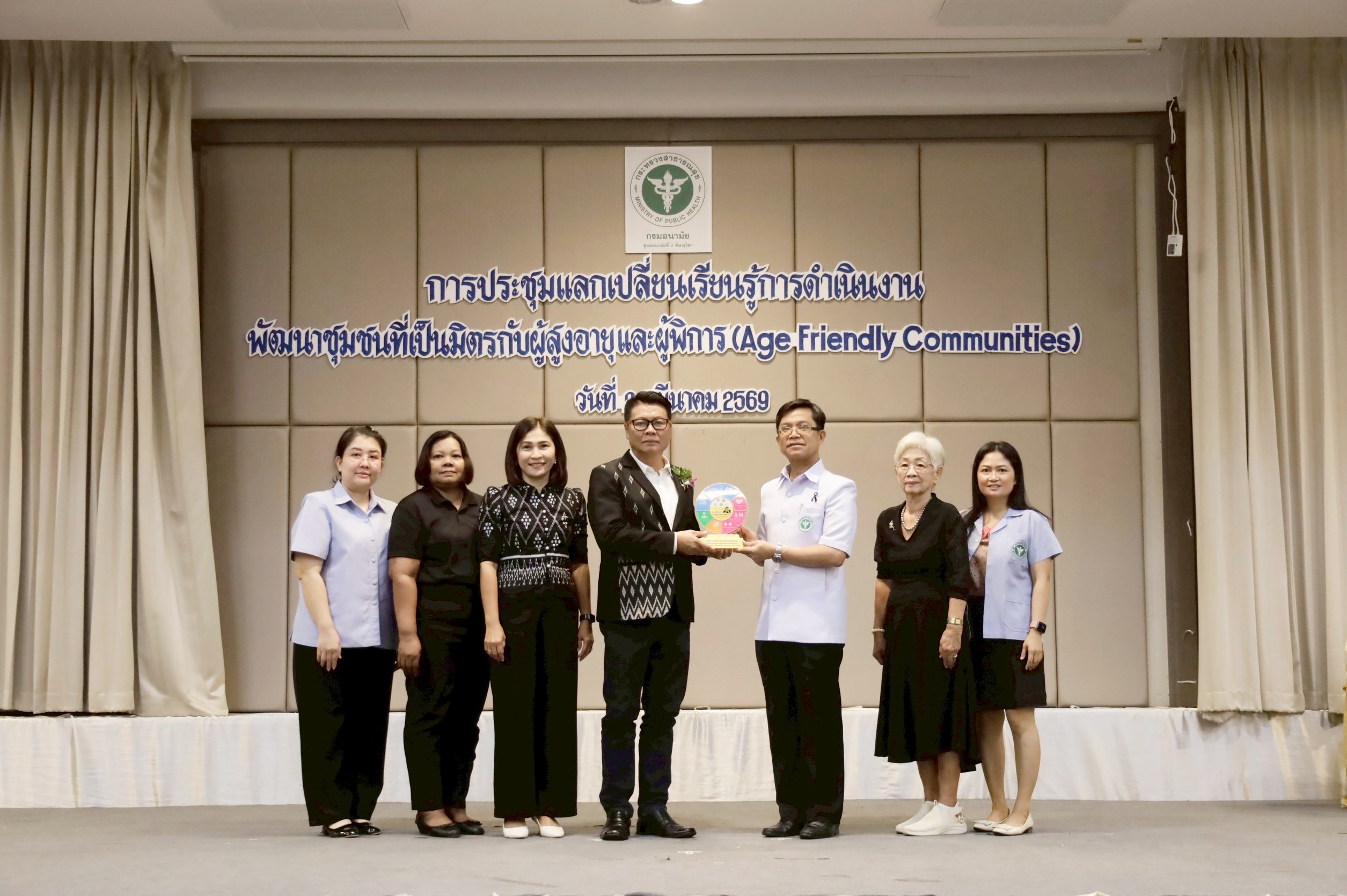 นายแพทย์วิทยา พลสีลา สาธารณสุขนิเทศก์ ปฏิบัติหน้าที่แทนผู้ตรวจราชการกระทรวงสาธารณสุข เขตสุขภาพที่ 2 เป็นประธานเปิดการประชุมและมอบโล่ตราสัญลักษณ์ชุมชนที่เป็นมิตรกับผู้สูงอายุและผู้พิการ (Age – Friendly Communities) ปีงบประมาณ 2569 เขตสุขภาพที่ 2 วันที่ 24 มีนาคม 2569 ณ โรงแรมเมย์ฟลาวเวอร์ แกรนด์ พิษณุโลก โดยมีแพทย์หญิงไสววรรณ ไผ่ประเสริฐ ผู้อำนวยการศูนย์อนามัยที่ 2 พิษณุโลก กล่าวรายงานการประชุม วัตถุประสงค์ในการจัดประชุมในครั้งนี้เพื่อให้เกิดการแลกเปลี่ยนเรียนรู้ในพื้นที่ที่เป็นต้นแบบและการดำเนินการประเมินชุมชนที่เป็นมิตรกับผู้สูงอายุและผู้พิการ (Age – Friendly Communities) กับพื้นที่ใหม่ที่จะมีการพัฒนาและขอรับรองมาตรฐาน รวมถึงพัฒนาระบบการส่งเสริมสุขภาพผู้สูงอายุครอบคลุมทุกมิติตามบริบทของพื้นที่ โดยบูรณาการความร่วมมือกับทีมสหวิชาชีพและภาคีเครือข่ายทุกภาคส่วนที่เกี่ยวข้องในการดูแลส่งเสริมสุขภาพผู้สูงอายุ จัดประชุมโดยนางรัชฎา จอปา รองผู้อำนวยการศูนย์อนามัยที่ 2 พิษณุโลก และกลุ่มพัฒนาการส่งเสริมสุขภาพวัยสูงอายุ ผู้เข้าร่วมประชุมประกอบด้วยคณะผู้บริหาร ผู้รับผิดชอบงานชุมชนที่เป็นมิตรกับผู้สูงอายุและผู้พิการ ขององค์กรปกครองส่วนท้องถิ่น สำนักงานสาธารณสุขจังหวัด สำนักงานสาธารณสุขอำเภอ โรงพยาบาลชุมชน โรงพยาบาลส่งเสริมสุขภาพตำบล ชมรมผู้สูงอายุ สำนักงานคณะกรรมสุขภาพแห่งชาติ และคณะกรรมการเขตสุขภาพเพื่อประชาชน เขตพื้นที่ 2 จำนวนทั้งสิ้น 115 คน