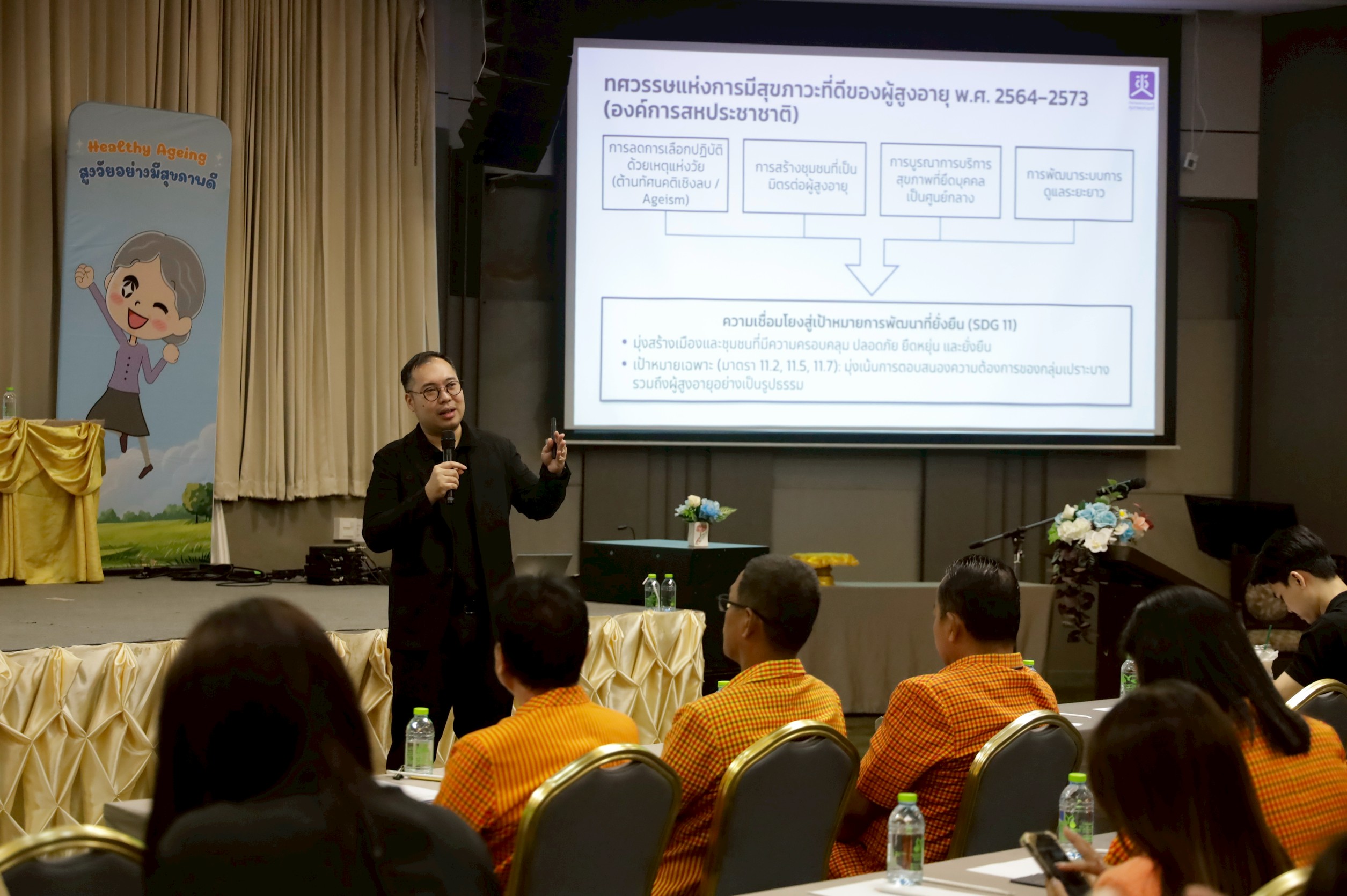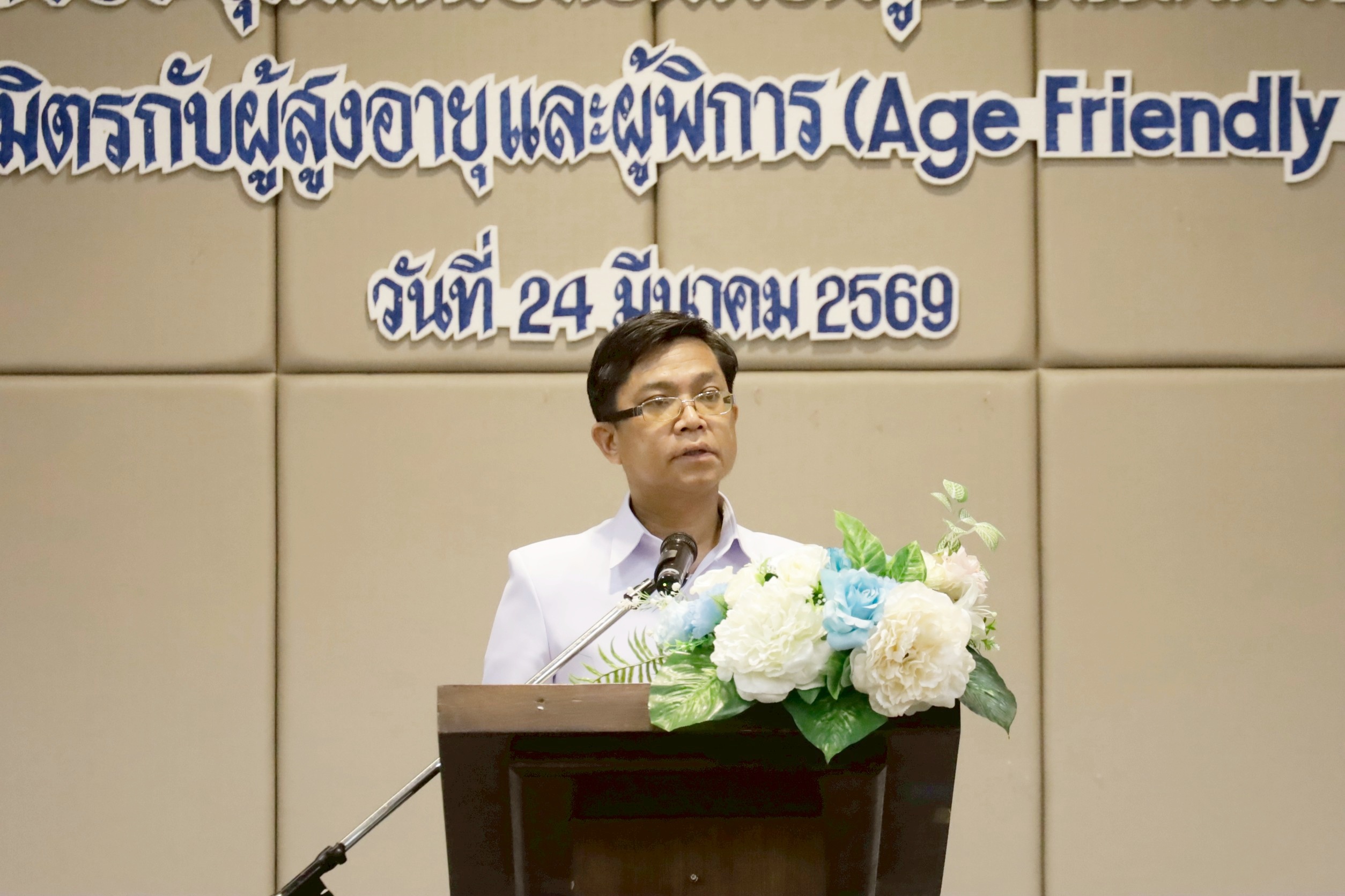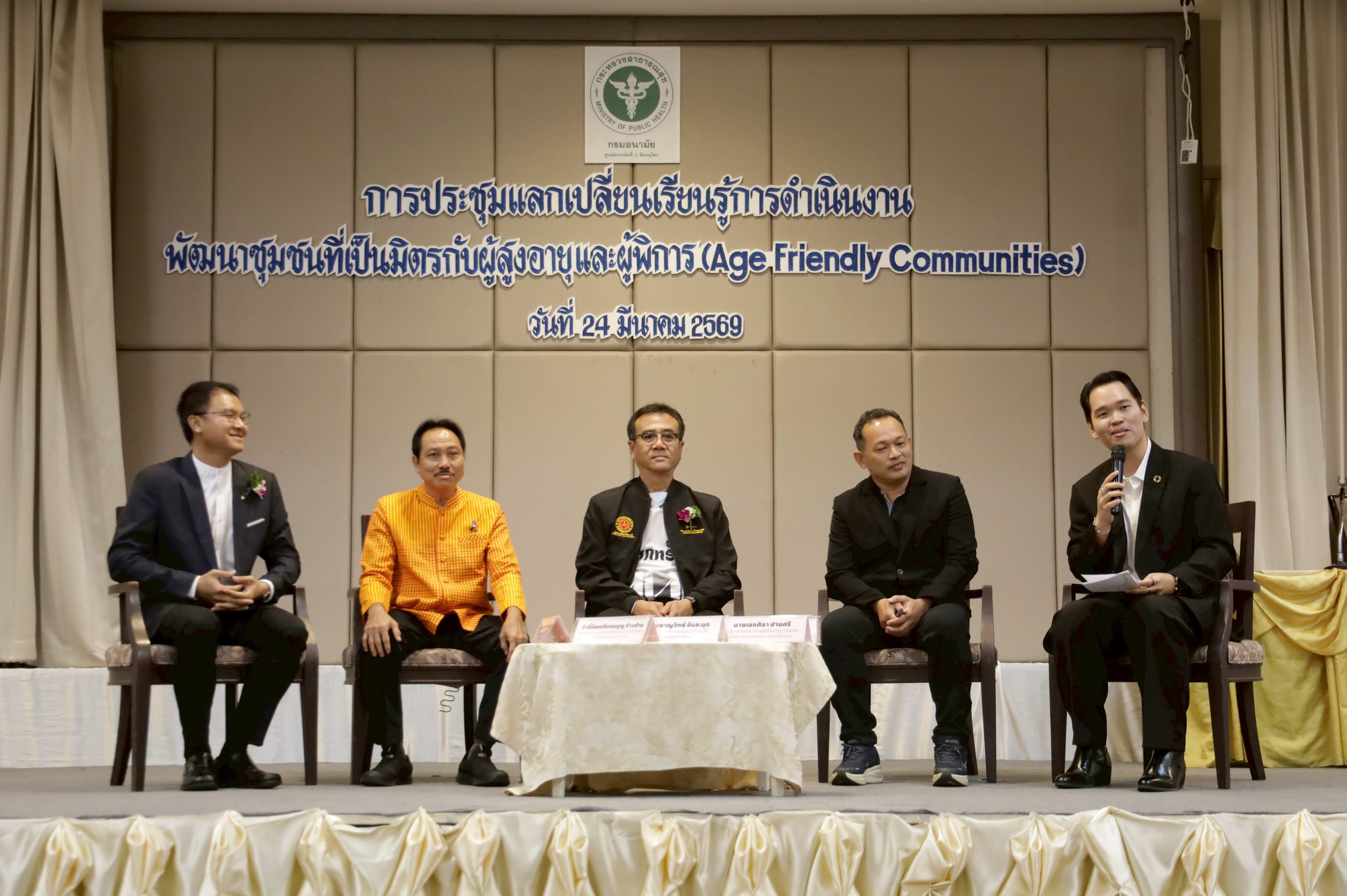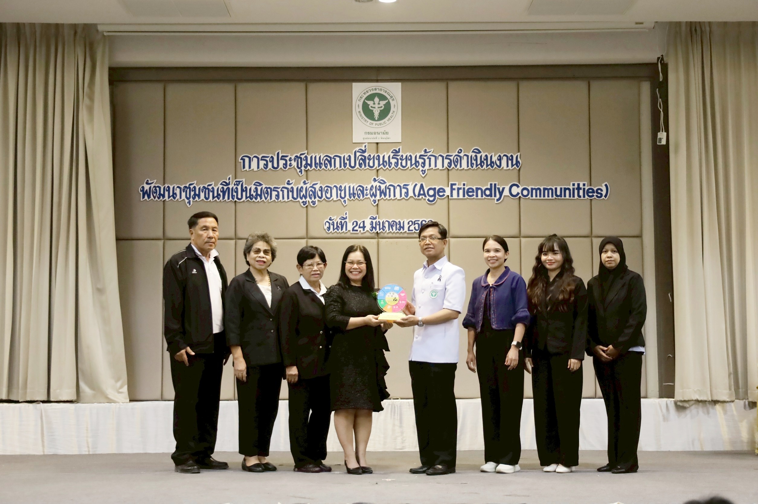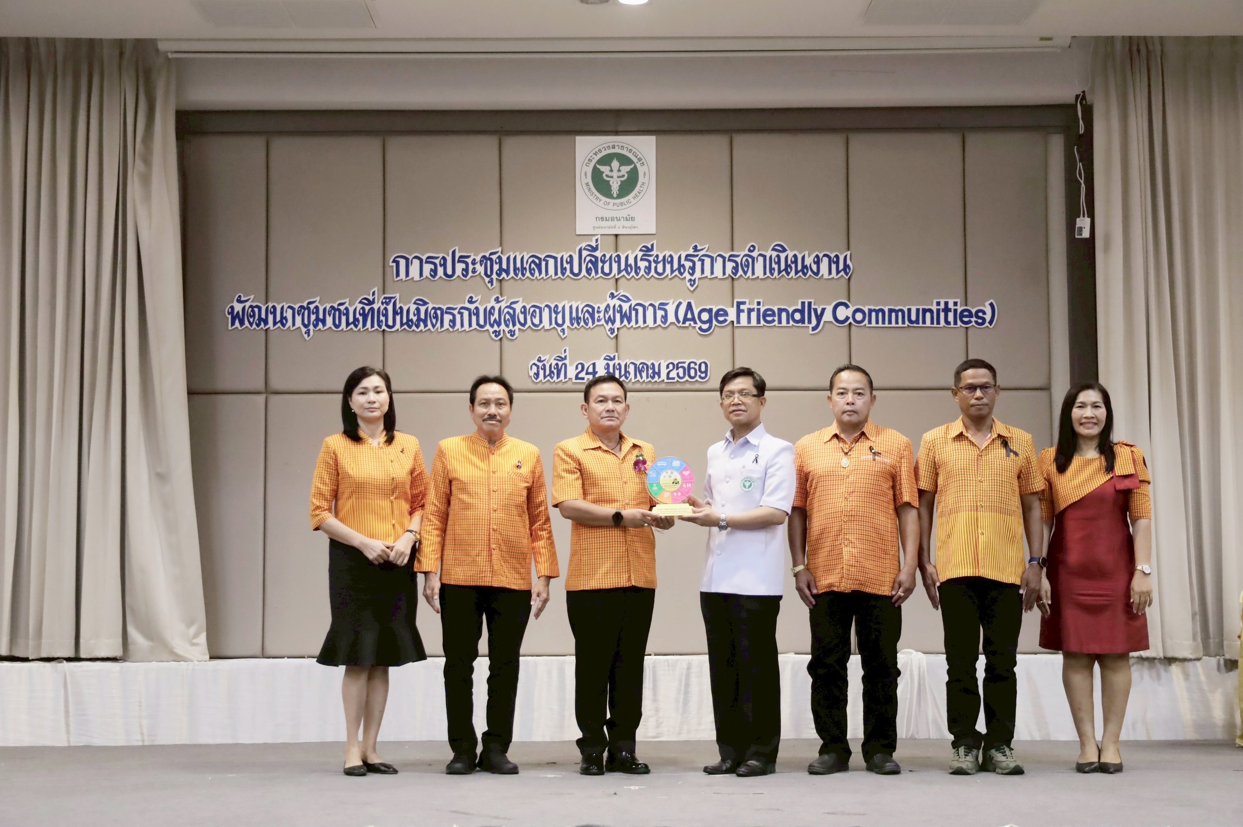 นายแพทย์วิทยา พลสีลา สาธารณสุขนิเทศก์ ปฏิบัติหน้าที่แทนผู้ตรวจราชการกระทรวงสาธารณสุข เขตสุขภาพที่ 2 เป็นประธานเปิดการประชุมและมอบโล่ตราสัญลักษณ์ชุมชนที่เป็นมิตรกับผู้สูงอายุและผู้พิการ (Age – Friendly Communities) ปีงบประมาณ 2569 เขตสุขภาพที่ 2 วันที่ 24 มีนาคม 2569 ณ โรงแรมเมย์ฟลาวเวอร์ แกรนด์ พิษณุโลก โดยมีแพทย์หญิงไสววรรณ ไผ่ประเสริฐ ผู้อำนวยการศูนย์อนามัยที่ 2 พิษณุโลก กล่าวรายงานการประชุม วัตถุประสงค์ในการจัดประชุมในครั้งนี้เพื่อให้เกิดการแลกเปลี่ยนเรียนรู้ในพื้นที่ที่เป็นต้นแบบและการดำเนินการประเมินชุมชนที่เป็นมิตรกับผู้สูงอายุและผู้พิการ (Age – Friendly Communities) กับพื้นที่ใหม่ที่จะมีการพัฒนาและขอรับรองมาตรฐาน รวมถึงพัฒนาระบบการส่งเสริมสุขภาพผู้สูงอายุครอบคลุมทุกมิติตามบริบทของพื้นที่ โดยบูรณาการความร่วมมือกับทีมสหวิชาชีพและภาคีเครือข่ายทุกภาคส่วนที่เกี่ยวข้องในการดูแลส่งเสริมสุขภาพผู้สูงอายุ จัดประชุมโดยนางรัชฎา จอปา รองผู้อำนวยการศูนย์อนามัยที่ 2 พิษณุโลก และกลุ่มพัฒนาการส่งเสริมสุขภาพวัยสูงอายุ ผู้เข้าร่วมประชุมประกอบด้วยคณะผู้บริหาร ผู้รับผิดชอบงานชุมชนที่เป็นมิตรกับผู้สูงอายุและผู้พิการ ขององค์กรปกครองส่วนท้องถิ่น สำนักงานสาธารณสุขจังหวัด สำนักงานสาธารณสุขอำเภอ โรงพยาบาลชุมชน โรงพยาบาลส่งเสริมสุขภาพตำบล ชมรมผู้สูงอายุ สำนักงานคณะกรรมสุขภาพแห่งชาติ และคณะกรรมการเขตสุขภาพเพื่อประชาชน เขตพื้นที่ 2 จำนวนทั้งสิ้น 115 คน